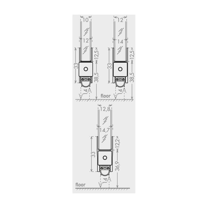 pour portes tout verre à 1 et 2 battants, course 14 mm, valeur d'isolation acoustique 38 dB, profil intérieur extractible même après le montage, déclenchement unilatéral avec abaissement parallèle, ne traîne pas par terre, égalisation automatique en cas de sol oblique, peut être raccourci de 125 mm, joint en silicone, cache fourni