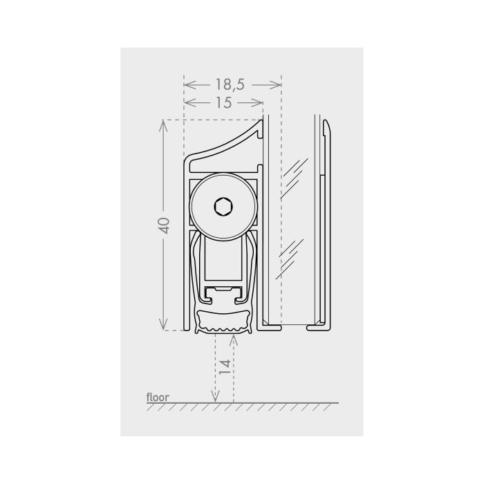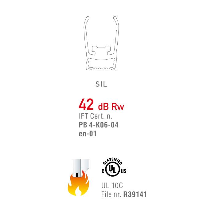 pour portes tout verre à 1 et 2 battants, course 14 mm, valeur d'isolation acoustique 42 dB (pour atteindre cette valeur, il faut utiliser le ruban adhésif double face haute densité fourni), résistant au feu, déclenchement unilatéral avec abaissement parallèle, ne traîne pas par terre, égalisation automatique en cas de sol oblique, peut être raccourci de 125 mm, cache fourni